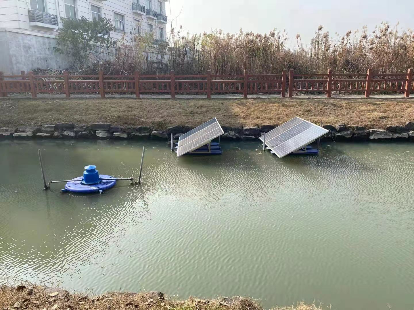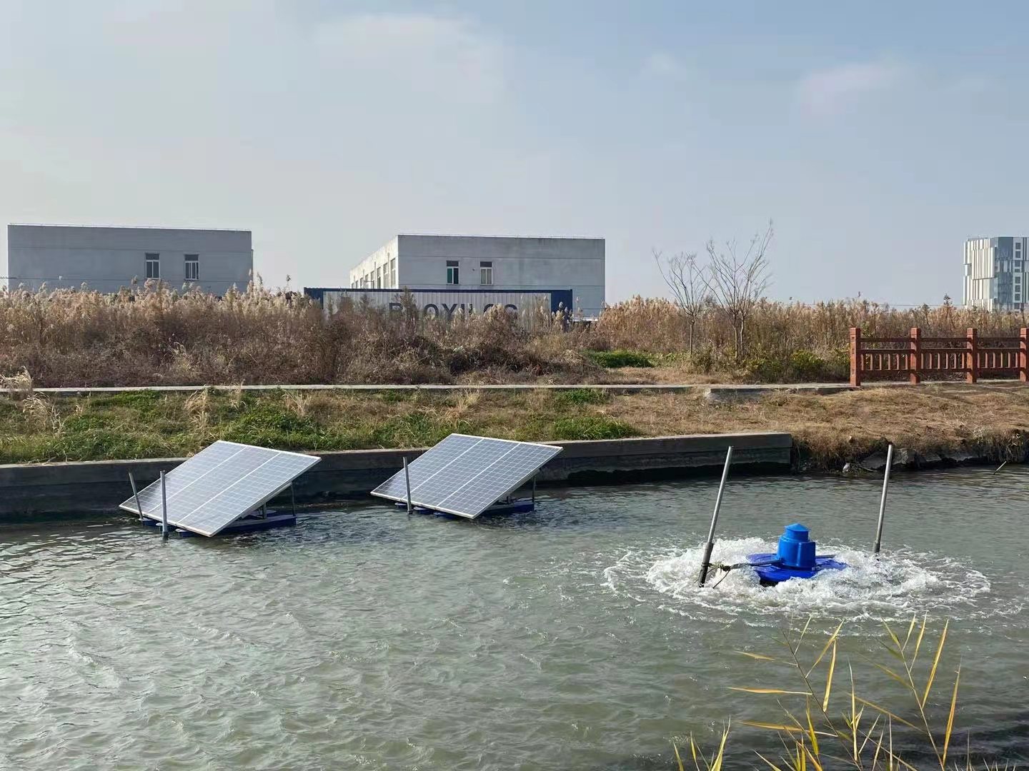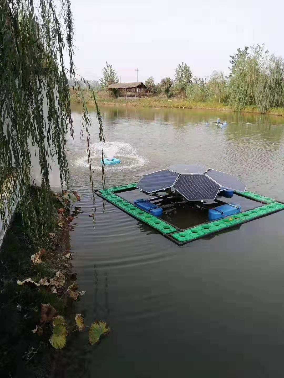 太陽能曝氣機,以太陽能作為設備運轉的直接動力,設置獨特的旋切提拉曝氣葉輪,通過葉輪旋轉提升作用,將底部缺氧水轉移到水體表面與表層富氧水混合;表層富含水通過離心旋轉橫向水平擴散、縱向進入底層缺氧區(qū)。 由此實現水體解層、增氧和縱橫向循環(huán)交換三重功效,最大限度地將表層超飽和溶解氧水轉移到水體底層,增加底層水體溶解氧,消除自然分層,提高水體自凈能力。